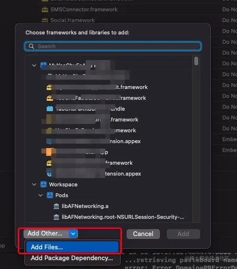 点击+号,选择Add Other,选择AddFiles,然后直接去到Pod目录下,找到BDPCAID,把它导入进来。