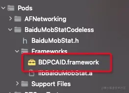 我马上在Pods上,先看下导入的BaiduMobStatCodeless,发现里面的确是有BDPCAID.framework,只是项目工程没有找到这个framework。