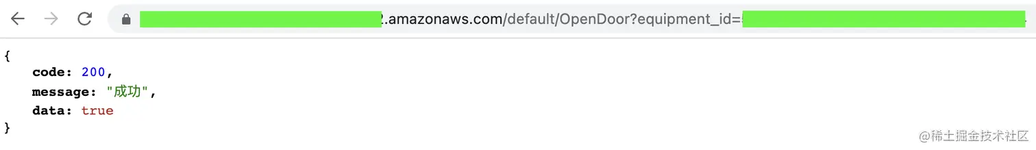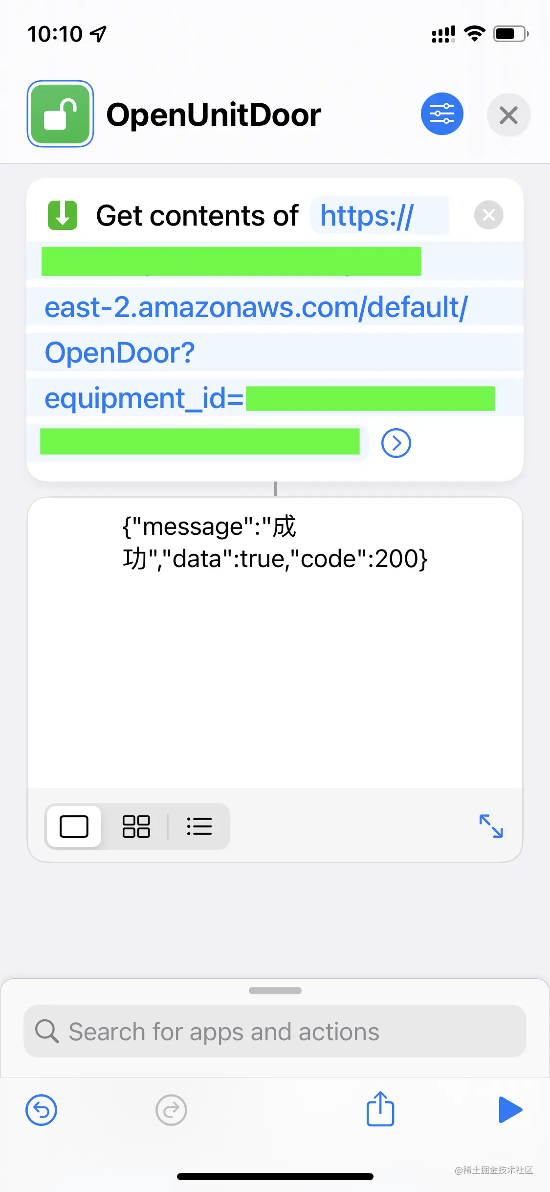 打开iOS捷径App,创建一个新捷径,搜索Get contents of这个动作,填入Lambda函数的URL和门的ID。由于API Gateway并没有配置认证,所以其他参数默认即可。如果有安全方面的顾虑,可以自己实现一个简单的Token认证或添加Lambda提供的JWT认证。点击执行,接口返回成功,证明整个流程已经跑通,以后就可以用这个捷径给自己和外卖小哥开门了。