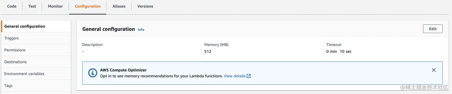 点击Deploy部署,然后运行测试,会出现超时的报错,这是因为Lambda函数默认的执行器内存大小是128MB,超时时间是3s,在配置页面把内存改大一些,超时时间设置为10s就可以了。