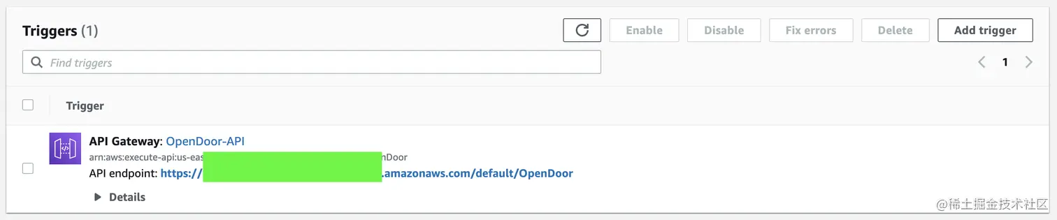 一个Lambda函数可以被多种形式触发执行,因为要使用捷径通过HTTP请求调用,所以加一个API Gateway Trigger,添加后会自动为函数生成一个URL,通过这个URL就可以直接调用函数。