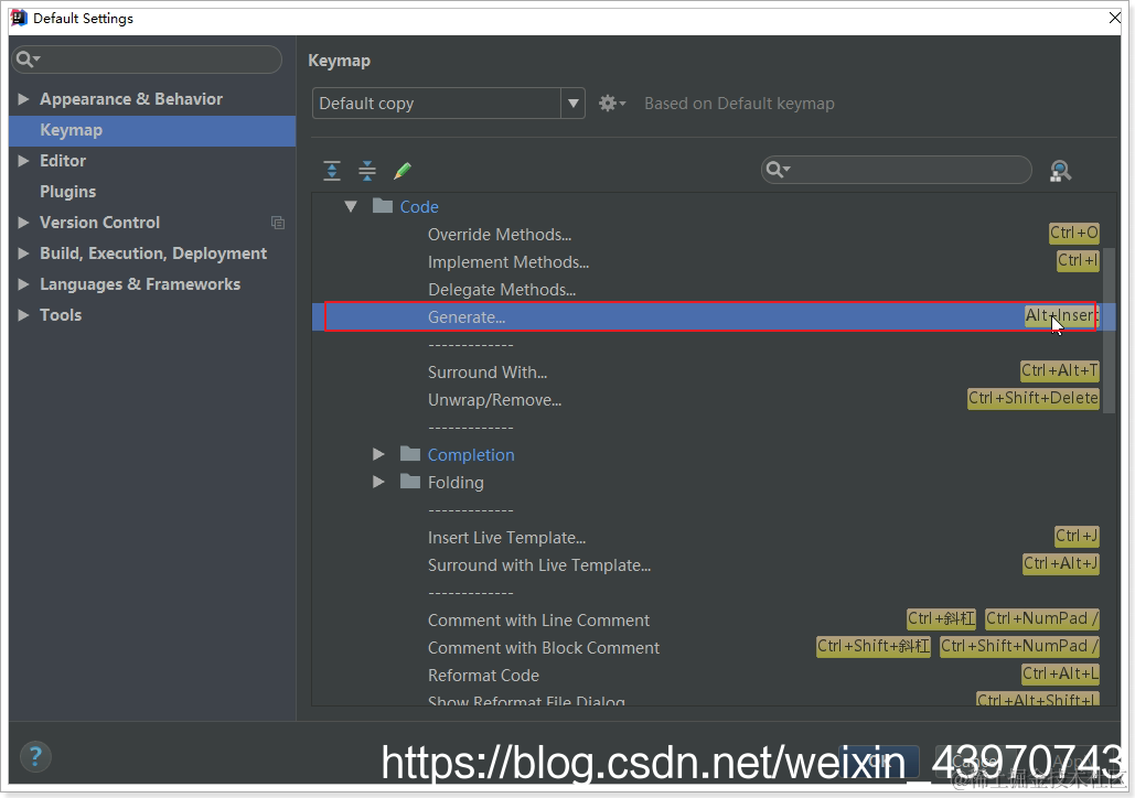 默认是Alt+Insert,没有Insert按键的同学,可以修改。我设置的也是Alt+ I