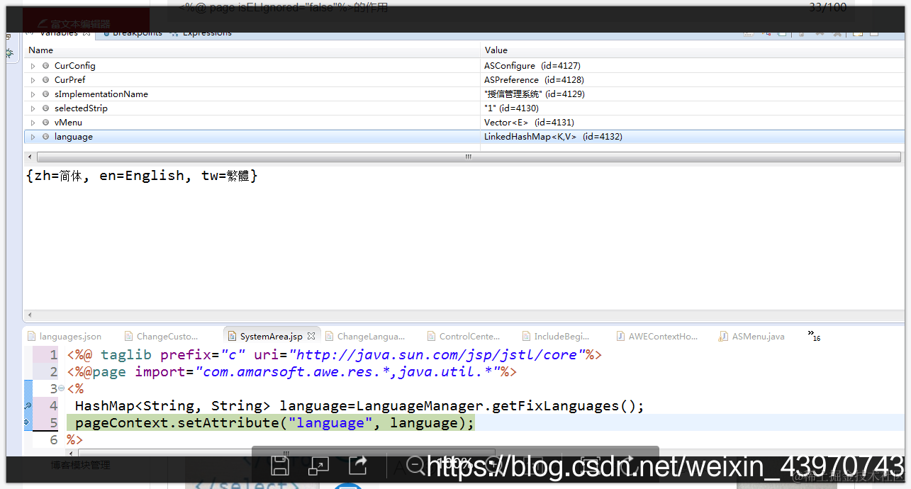 通过debug模式,从后台取值并传值到前台来language有取到值,但是为啥jsp页面渲染不出,而前台JSP页面EL表达式无效,解析不到EL表达式,