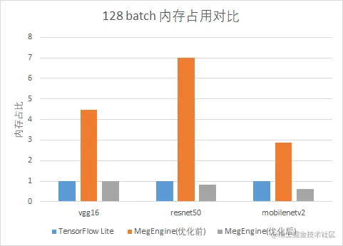 在正式进入本文前,先通过一组简单的对比来直观地感受一下,静态内存优化带来的内存占用上的提升。分别对 1batch/128batch 的 vgg16/resnet50/mobilenetv2 模型,使用 tflite tools 得到 tflite 的峰值内存,与 megengine 内存优化前后的峰值内存进行对比: