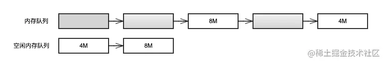 - 全部内存信息队列(后简称内存队列):按地址顺序记录所有已经申请的内存,包括使用中(灰色部分标记)和空闲(白色部分标记)两种状态。