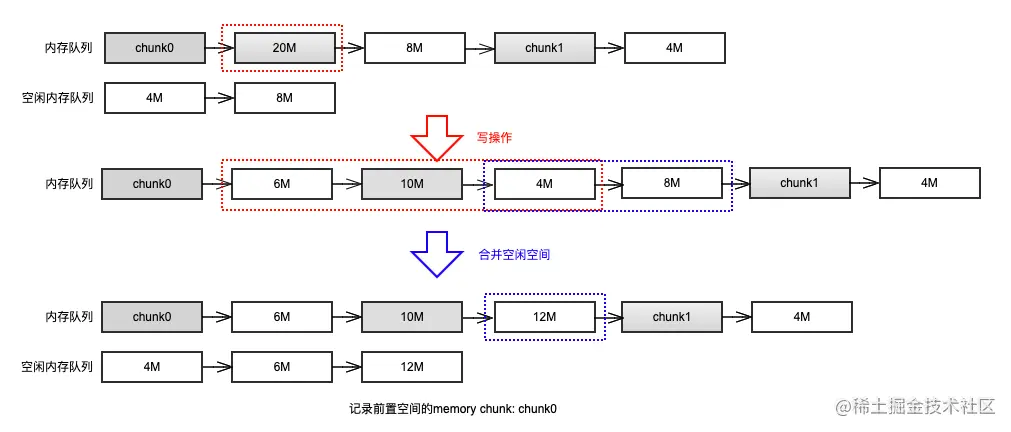 举一个例子进行说明,假设有一个写依赖关系如 b(1) 图示:chunk2 对 chunk1 进行写操作,且 offset = 6M,size = 10M,chunk1 的大小为 20M。由此可以推断出,在写操作完成后,原 chunk1 的 20M 空间被分解为前面 6M 的空闲空间,中间 10M 的写覆盖的空间,后面 4M 的空闲空间。那么将前后空闲空间释放的操作就如下图所示: