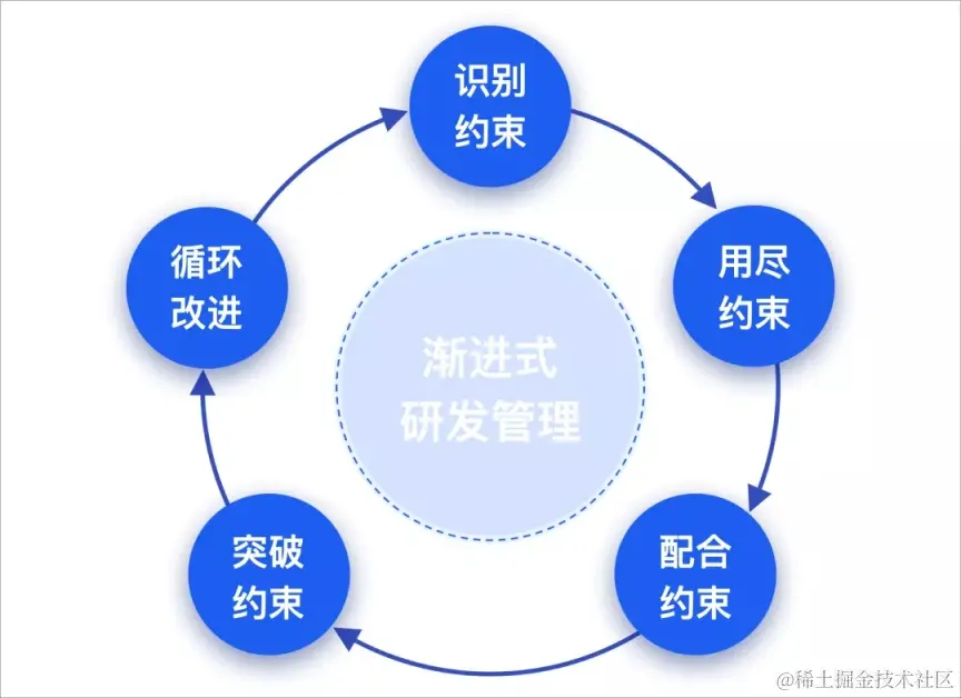 我们可以利用「约束理论」来进行研发过程中的「道路疏通」。约束理论是指,实际业务中瓶颈节点的节拍决定了整个业务流程,它分为五个步骤,分别是:识别约束、用尽约束、配合约束、突破约束,然后再回到第一步来,进行循环改进。根据这个理论,我们可以不断地识别瓶颈、突破瓶颈,最终实现效能的渐进式改进。