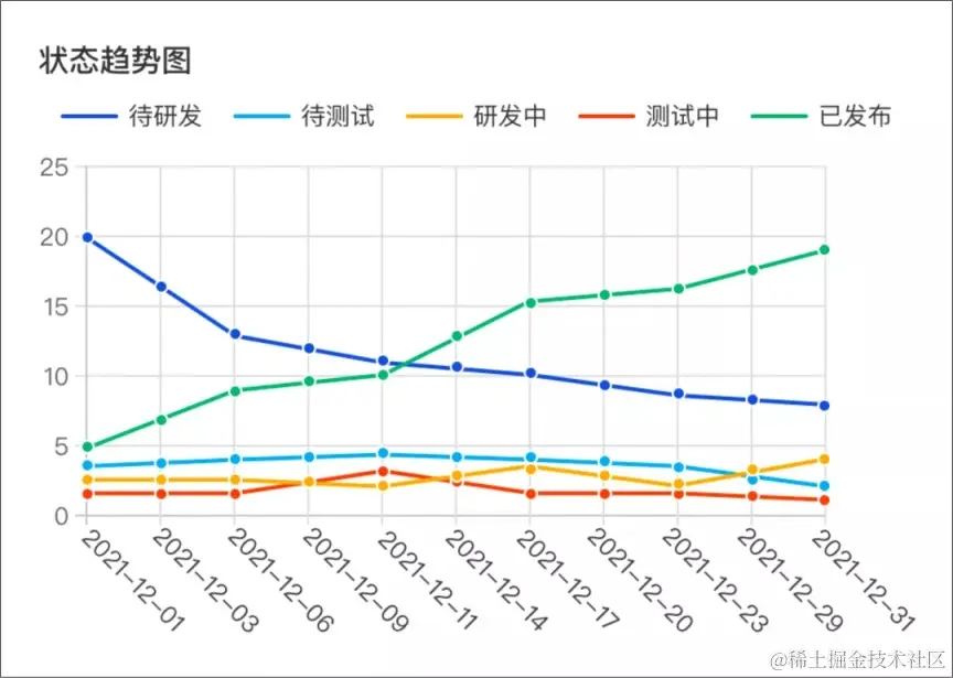 我们对改进措施进行了持续观测,实施两三个月后,团队的需求周期时间新增集中在了 5 天、10 天、20 天,交付时间可预测性增强。同时,待研发需求数量持续下降并稳定在了健康水平,并行的任务也维持在了 2-3 个,研发流程的瓶颈环节得到一定的疏通。
