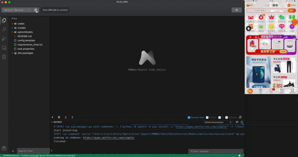 MNN 工作台提供了端 AI 的研发范式,同时它也是一个对移动端 Python 的通用调试编辑器,工作台不仅包含标准的端侧 Python 调试能力,还覆盖了阿里集团内端智能算法常用的研发部署场景,是算法研发的效率工具。