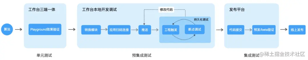 算法在上线前在平台进行集成测试,而单元测试和预集成测试都可以在工作台环境中进行。