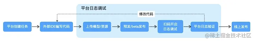 在此之前,端计算的研发是依赖于平台发布的,在开发阶段将调试日志加到代码中,通过预发/beta发布到平台,然后再扫码连接到平台将日志输出,通过日志来定位和分析问题,以此往复。这种方式相对比较原始,开发调试周期也比较长,一次修改或验证就是一轮上传发布的操作,而且调试信息只有日志,整体开发效率比较低。