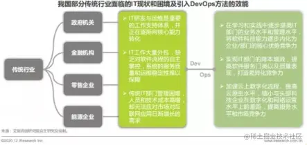 艾瑞咨询 2020 年的“中国 DevOps 应用发展研究报告”,将企业对于 DevOps 的诉求做了总结和归纳,按照“传统行业”和“科技行业”的分类方法做了如下阐述: