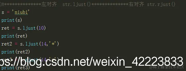 | ljust | 让字符串在指定的长度左齐,可以指定填充内容,默认以空格填充 | |