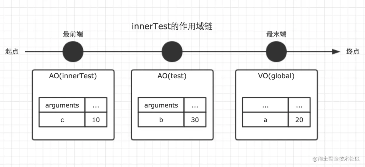 这个例子的执行上下文创建的顺序 为: 全局上下文、test函数上下文、innerTest函数上下文。我们设他们的变量对象为VO(global)、VO(test)、VO(innerTest)。每一层作用域链包含它上一层的作用域链。