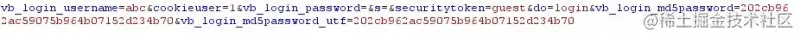 看雪论坛使用http明文传输登录信息,password做了一次MD5运算。由于MD5是不可逆的,理论上无法推出password。但对于黑客来说其实无需知道password具体是多少,用password的MD5值构造一个数据包模拟发送给服务器,同样可以收到有效的cookie信息成功登陆。这就是所谓的重放攻击。下图是登陆数据包,202cb962ac59075b964b07152d234b70是密码123的MD5值。