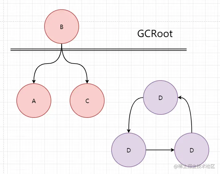 根可达算法,就是对象到达GcRoot的路径是否还有可达,即是否有可引用链,如果有,这表明对象还存在着引用, 如果没有,则表明该对象没有引用,在下一次垃圾回收时就会被回收