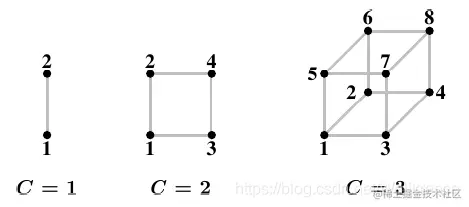 超立方体可以作为一种有效的拓扑来描述NUMA系统,它将系统中的节点数限制在2^C内,C是每个节点拥有的邻居节点数,如下图所示