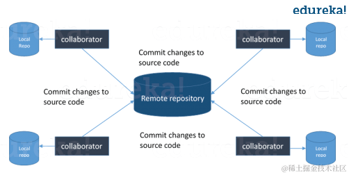 - 还有一个中央云存储库,开发人员可以向其提交更改,并与其他团队成员进行共享,如图所示,所有协作者都在提交更改“远程存储库”。