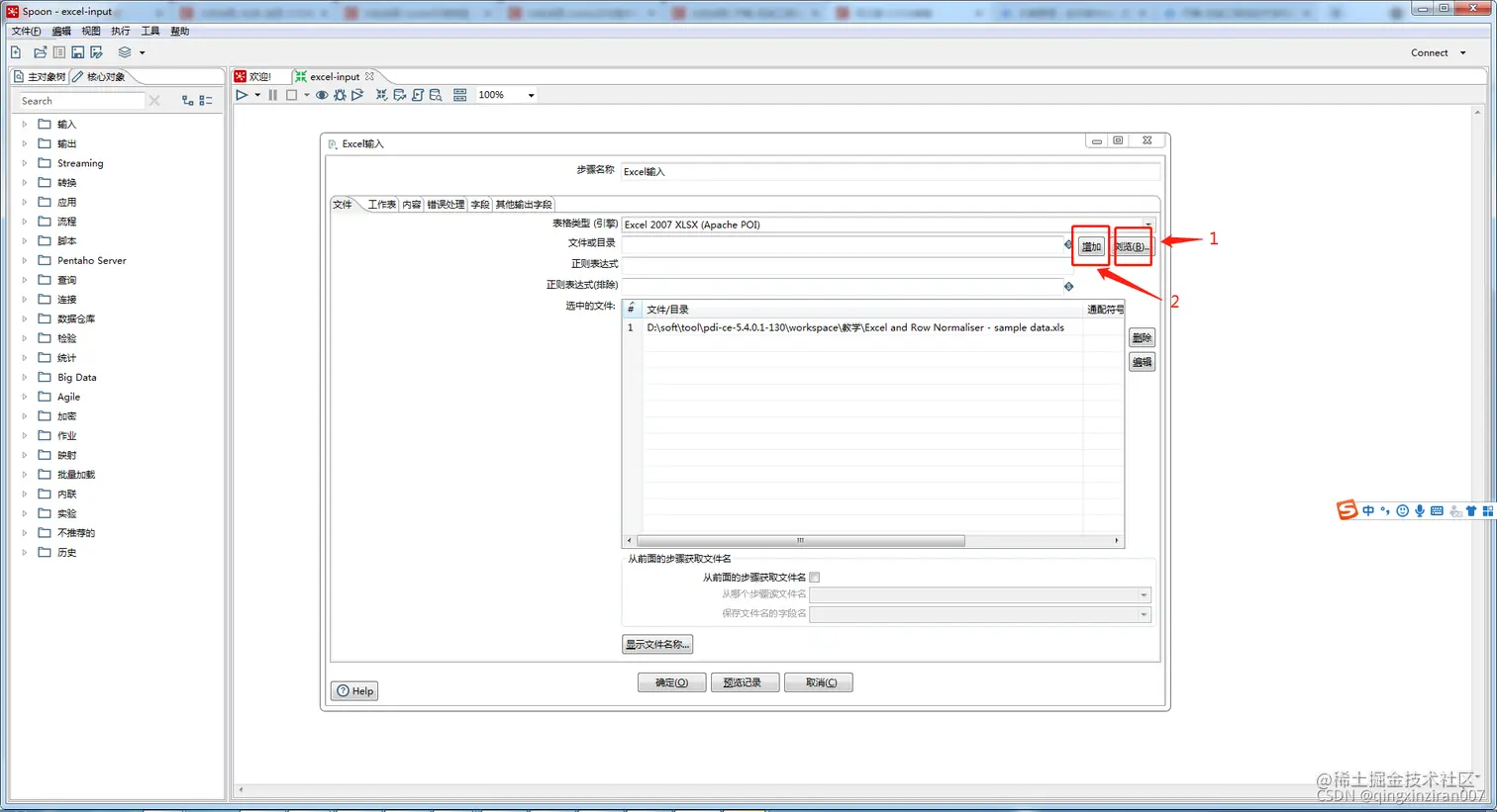 第二步:双击“文本文件输入”节点,进行配置,在“文件”选项卡中:1,点击浏览按钮选择本地txt文件;2,点击增加;