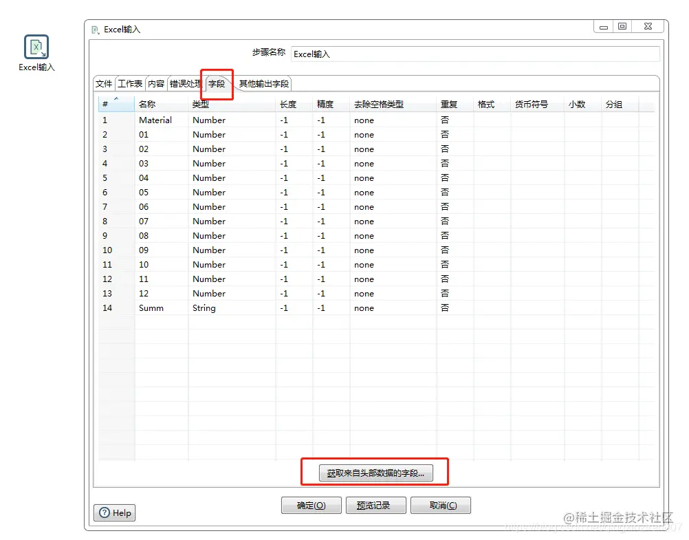 在“字段”选项卡中,点击“获取来自头部数据的字段”,如下图。(“内容”选项卡,“错误处理”选项卡,“其他输出字段”选项卡 不需要进行配置)