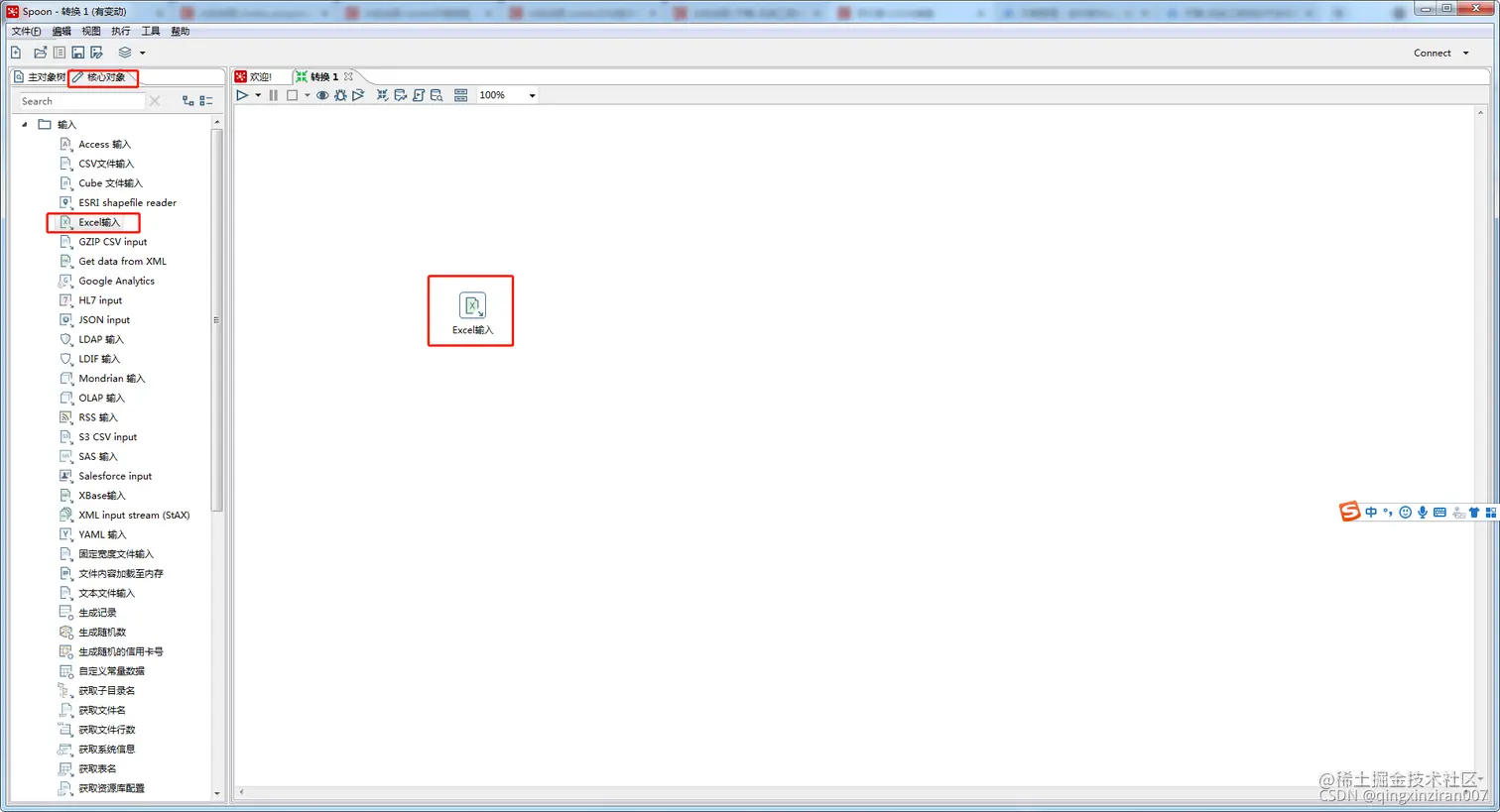 接着依次点击核心对象,输入,并在下拉列表中选择excel输入组件,并拖拽到工作空间上,