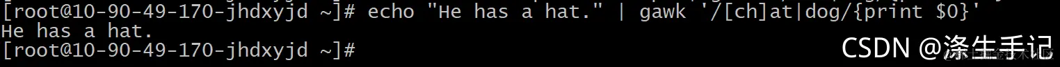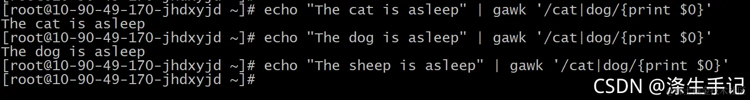 这个例子会在数据流中查找正则表达式 cat 或 dog 。正则表达式和管道符号之间不能有空格,