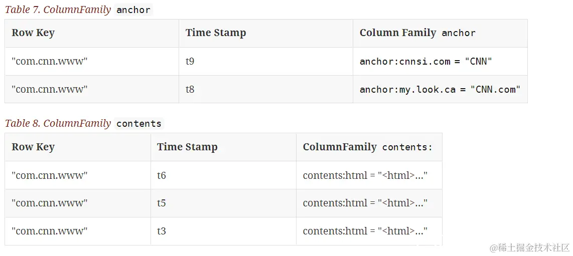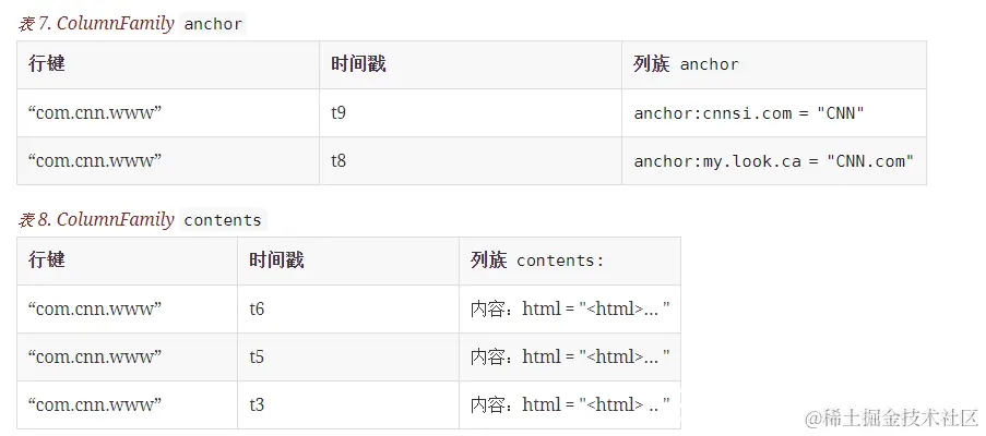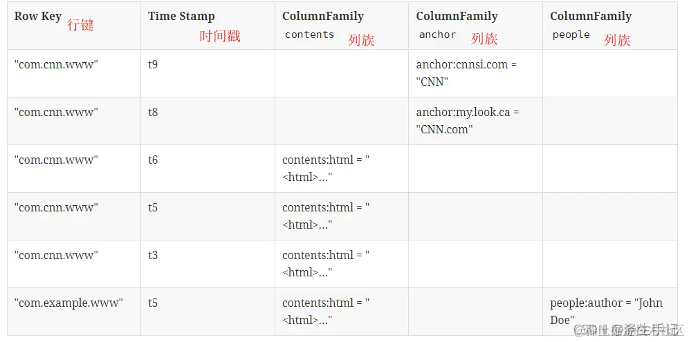 在这个例子中,对于第一行(com.cnn.www), anchor包含两列(anchor:cssnsi.com, anchor:my.look.ca), contents包含一列(contents:html)。这个例子包含行键为com.cnn.www的5个版本,以及行键为com.example.www的一个版本。