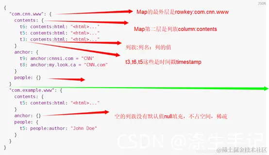 此表中看起来为空的单元格不占用空间,或者实际上存在于 HBase 中。这就是 HBase“稀疏”的原因。表格视图不是查看 HBase 中数据的唯一可能方式,甚至不是最准确的方式。以下表示与多维map相同的信息。但注意这只是用于说明Hbase模型,可能并不完全准确。