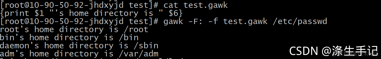 应用脚本文件只需要使用 -f 参数即可,此示例程序脚本会使用print命令输出/etc/passwd文件的主目录数据字段(字段变 量$6),以及userid数据字段(字段变量$1)。