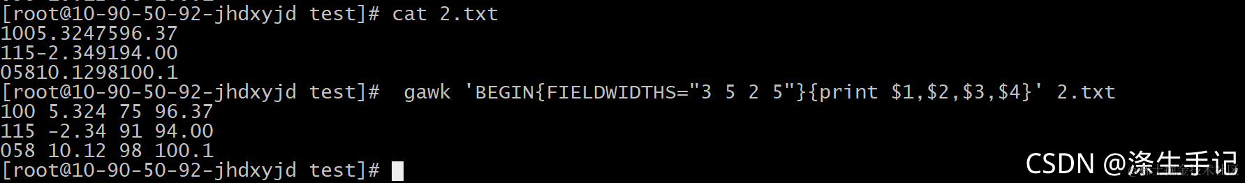 FIELDWIDTHS 变量定义了四个字段, gawk 依此来解析数据记录。每个记录中的数字串会根
