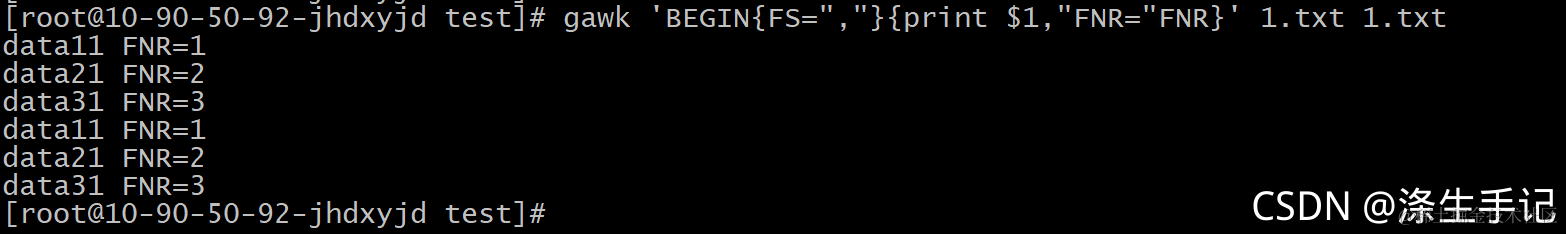 FNR 变量的值在 gawk 处理第二个数据文件时被重置了,而 NR 变量则在处理第二个数据文件时 继续计数。结果就是:如果只使用一个数据文件作为输入,FNR 和 NR 的值是相同的;如果使用多 个数据文件作为输入,FNR 的值会在处理每个数据文件时被重置,而 NR 的值则会继续计数直到处 理完所有的数据文件。