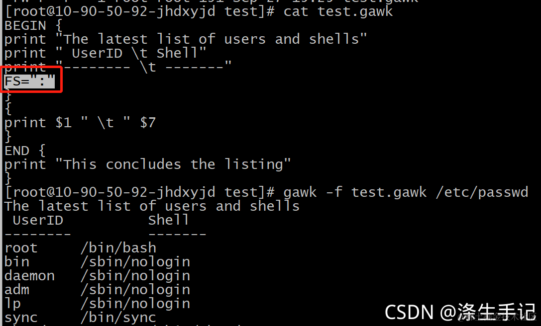 这个脚本定义了一个叫作FS的特殊变量。这是定义 字段分隔符的另一种方法。这样你就不用依靠脚本用户在命令行选项中定义字段分隔符了。