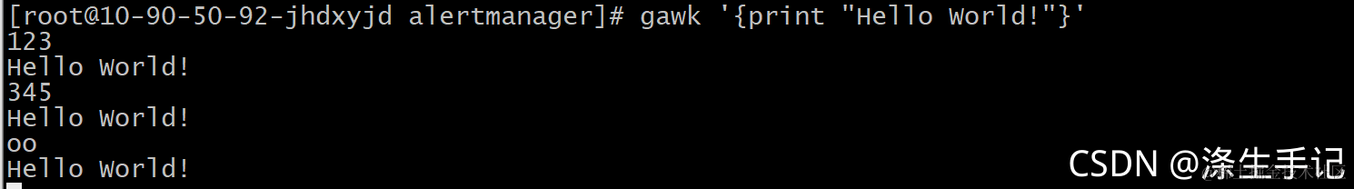 如果你操作这个示例在你的服务器终端,你会发现,并没有任何结果输出,而当你随意输入一个数字或者字符串的时候会发现都会返回 同一个结果,这个原因就在于没有在命令行上指 定文件名,所以gawk程序会从STDIN接收数据。在运行这个程序时,它会一直等待从STDIN输入 的文本。 如果你输入一行文本并按下回车键,gawk会对这行文本运行一遍程序脚本。和**sed**编辑器一 样,gawk程序会针对数据流中的每行文本执行程序脚本。由于程序脚本被设为显示一行固定的文 本字符串,因此不管你在数据流中输入什么文本,都会得到同样的文本输出。