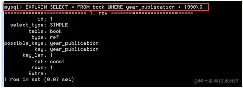 上面的一大堆东西能看懂多少看多少,我们最主要的是看possible_keys和key 这两个属性,上面显示了key为year_publication。说明使用了索引。