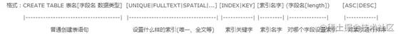 格式:CREATE [UNIQUE|FULLTEXT|SPATIAL] [INDEX|KEY] 索引名称 ON 表名(创建索引的字段名[length])[ASC|DESC]