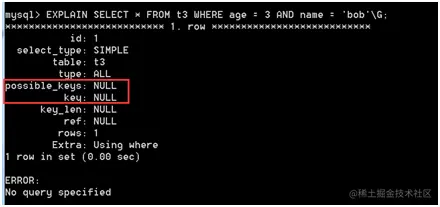EXPLAIN SELECT * FROM t3 WHERE age = 3 AND name = 'bob'\G;