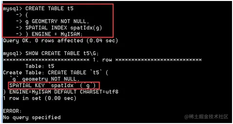 空间索引也必须使用MyISAM引擎, 并且空间类型的字段必须为非空。 这个空间索引具体能干嘛我也不知道,可能跟游戏开发有关,可能跟别的东西有关,等遇到了自然就知道了,现在只要求能够创建出来。