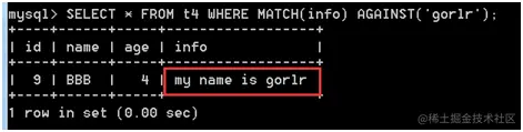 SELECT * FROM t4 WHERE MATCH(info) AGAINST('gorlr');