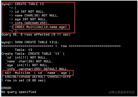 组合索引就是在多个字段上创建一个索引,创建一个表t3,在表中的id、name和age字段上建立组合索引