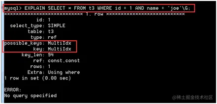 EXPLAIN SELECT * FROM t3 WHERE id = 1 AND name = 'joe'\G;