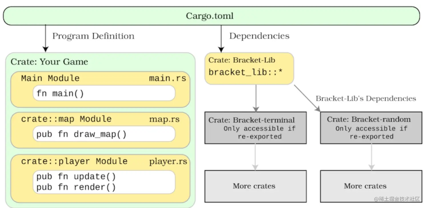 就犹如图上所示,我们需要创建两个模块组件:crate::map 和 crate::player