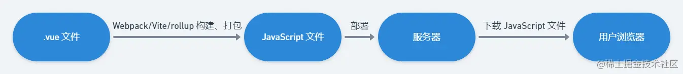 我们可以使用 Webpack/Vite/rollup 等工具对 .vue 文件中的代码进行构建,最终打包成浏览器能直接识别的 JavaScript 代码文件,然后可以把打包后的代码文件部署到服务器中,之后用户在进行浏览时,就应该是从服务器中请求下来代码,而这时请求下来的代码就已经是浏览器能够识别的代码了。最后在用户的浏览器中就能看到我们真正想要的效果了。