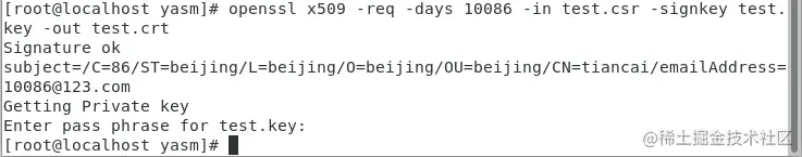 - openssl生成证书私钥(这里需要输入两次密码,请谨记)