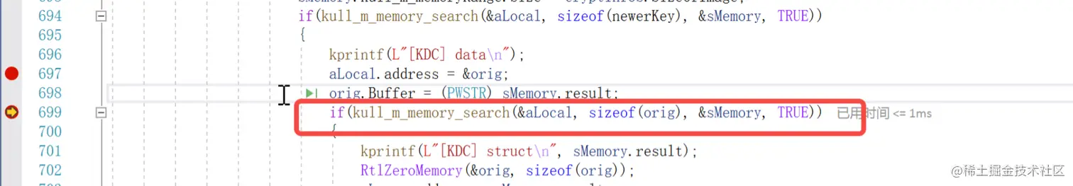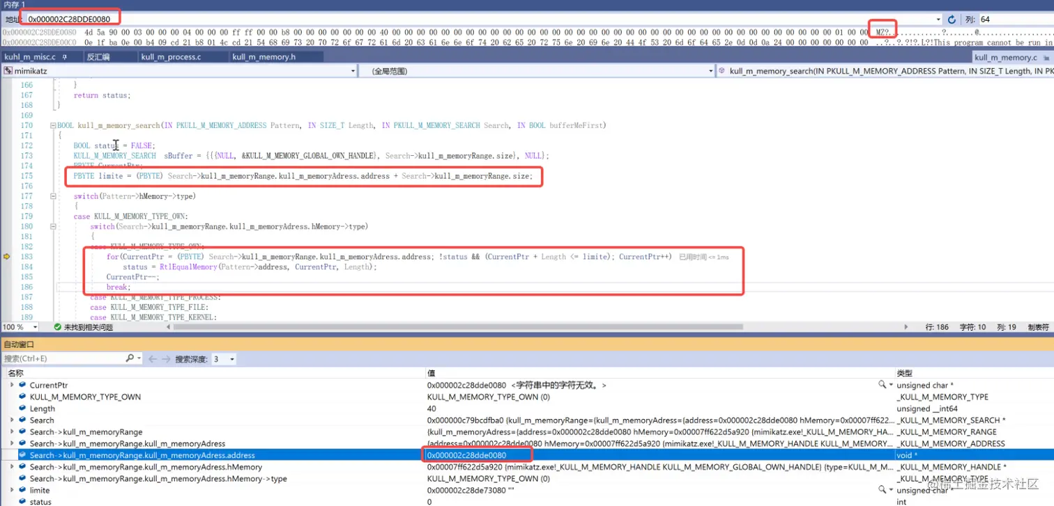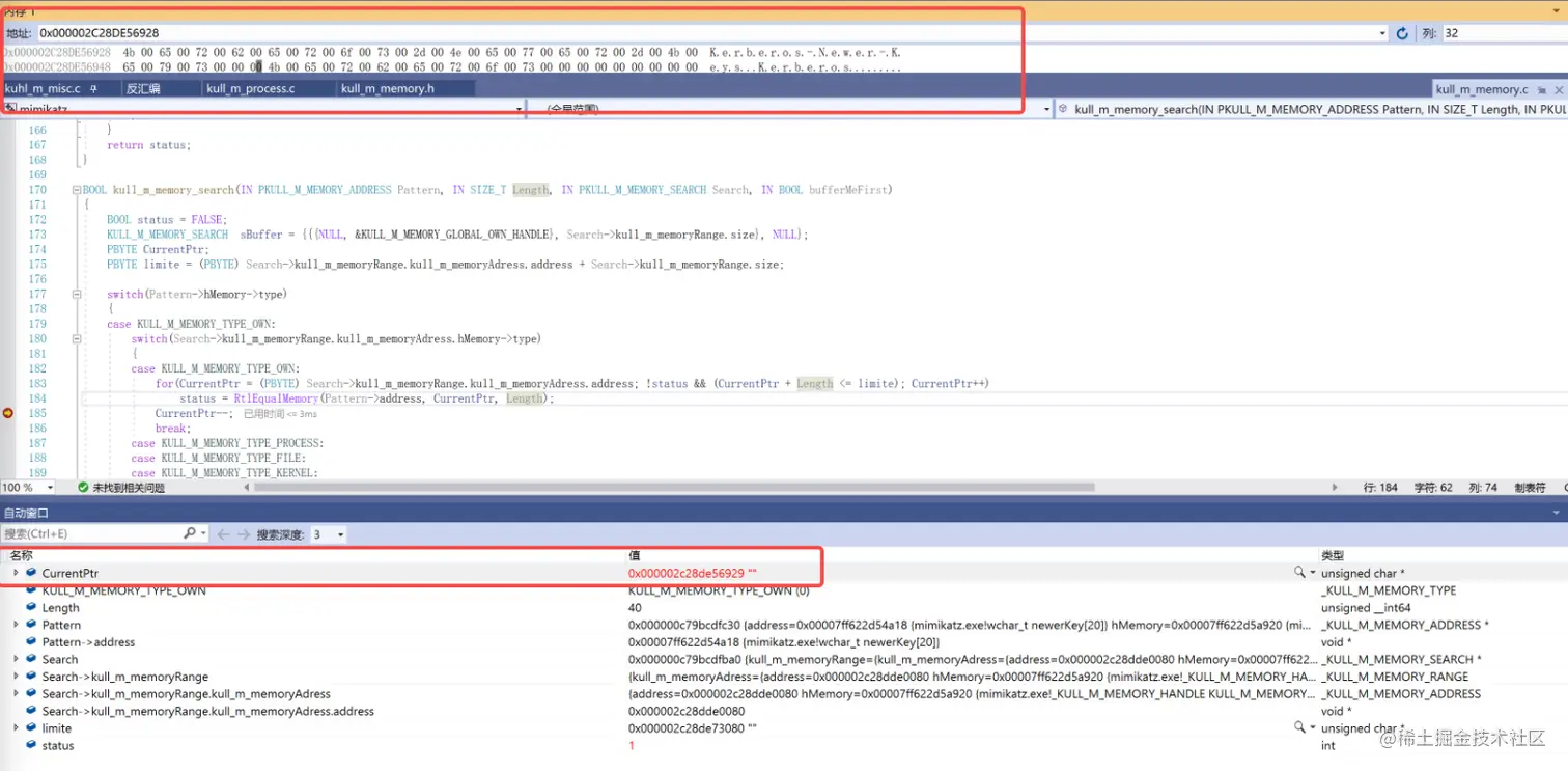 进入KULL_M_MEMORY_TYPE_OWNcase后利用for循环从kdcsvc.dll的首地址2c28dde0080开始查找Kerberos-Newer-Keys字符串,由于最后匹配上之后继续执行了一次curentPtr++后续通过currentptr--调整回来指向kdcsvc.dll中Kerberos-Newer-Keys字符串的正确地址