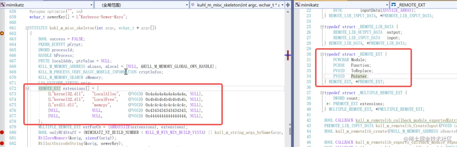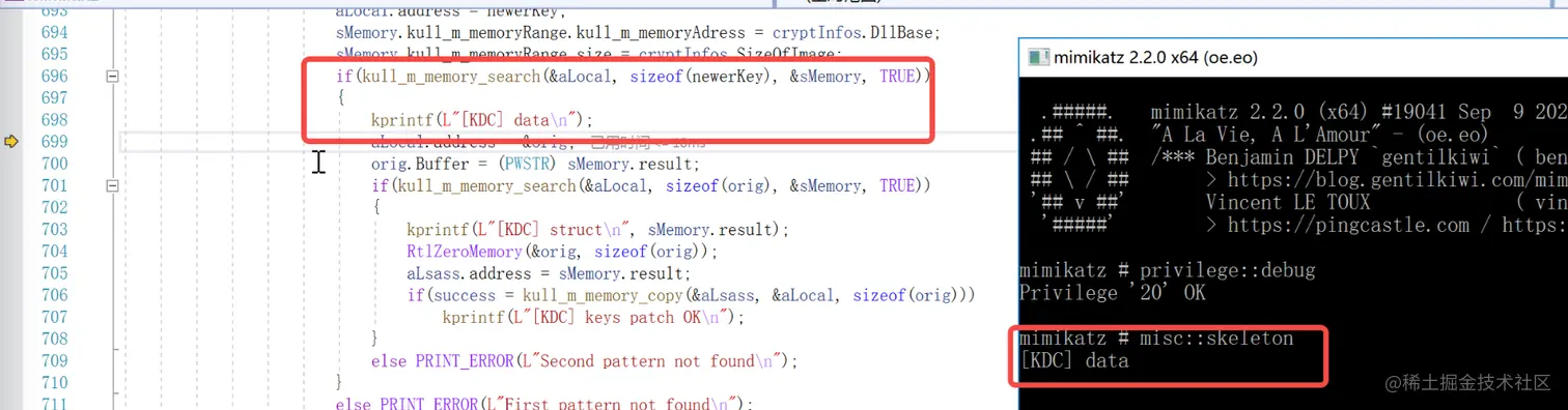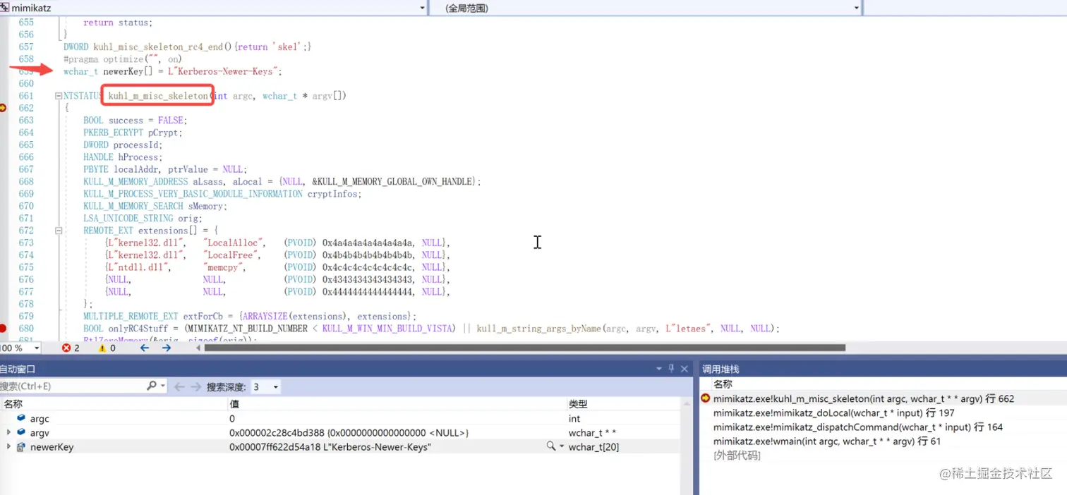 所以我们在这个kuhl_m_misc_skeleton函数下个断点当我们执行misc::skeleton时就可以执行到这里开始调试,在该函数开始前还定义一个数组存储了一个字符串Kerberos-Newer-Keys,这是个很重要的字符串后续用到的时候详细解释
