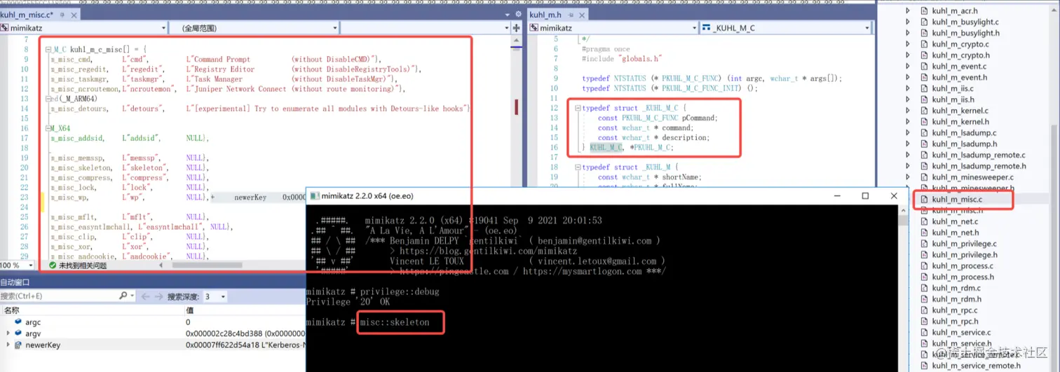 misc::skeleton功能模块在kuhl_m_misc.c文件中,从该c文件开头可以看到作者定义了一个结构体数组用来存储当前misc模块中具体有哪些功能,该结构体有3个成员第一个是功能函数,第二个是启动该功能的参数,第三个是功能描述所以我们今天要分析的skeleton在这个kuhl_m_misc_skeleton函数中启动命令为misc::skeleton暂无描述,可以看到其他该misc模块是有很多功能是日常使用中也没有用上后续可以挖掘功能