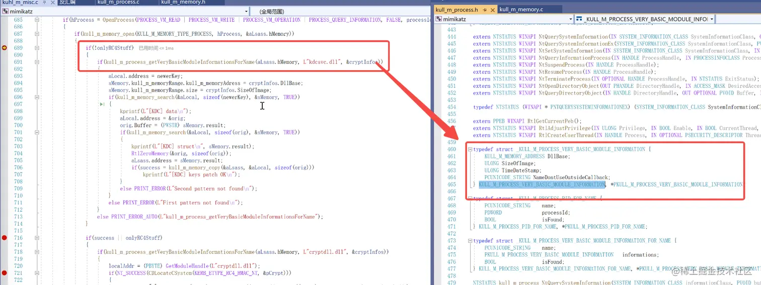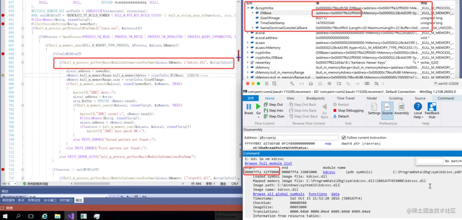 主要是利用PEB找到LDR以及双向链表InLoadOrderModuleList来遍历lsass进程模块找到kdcsvc.dll