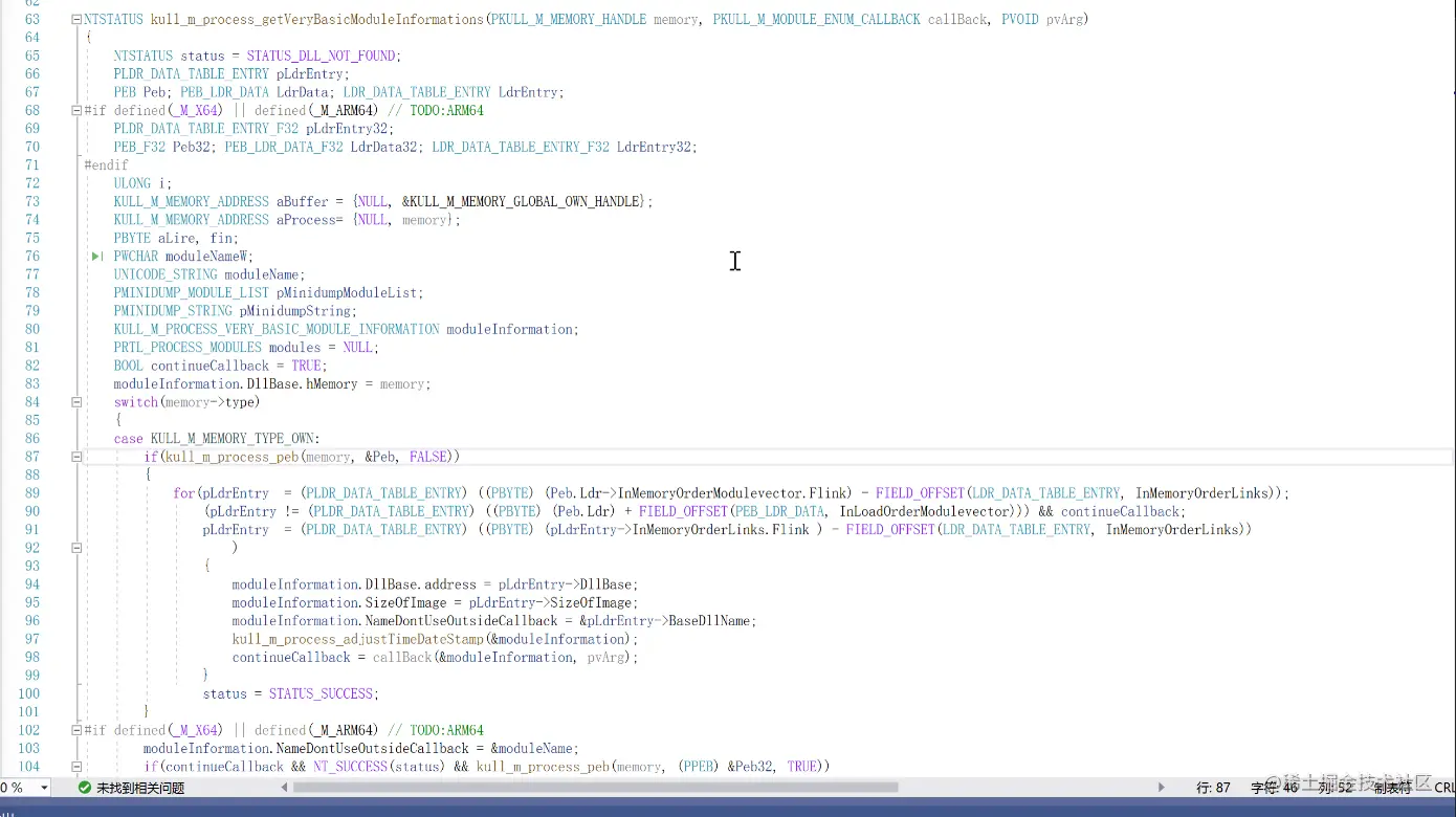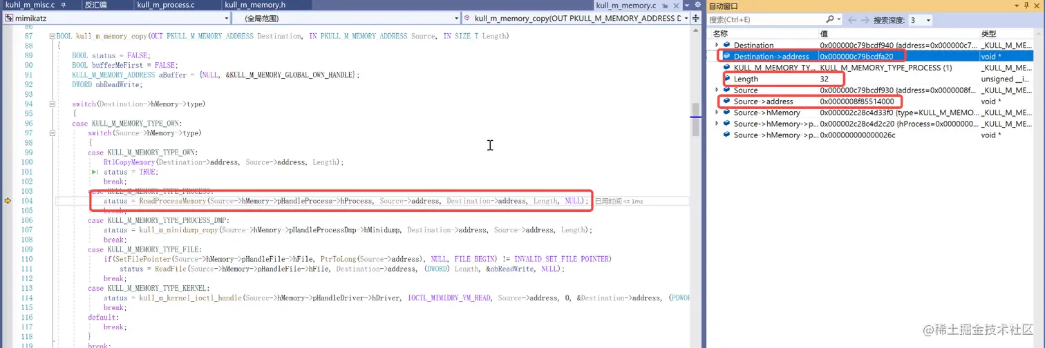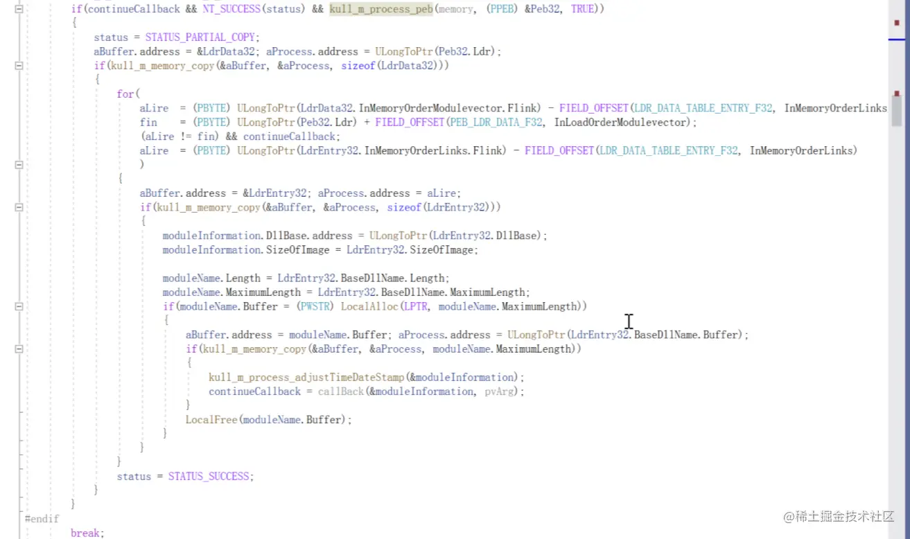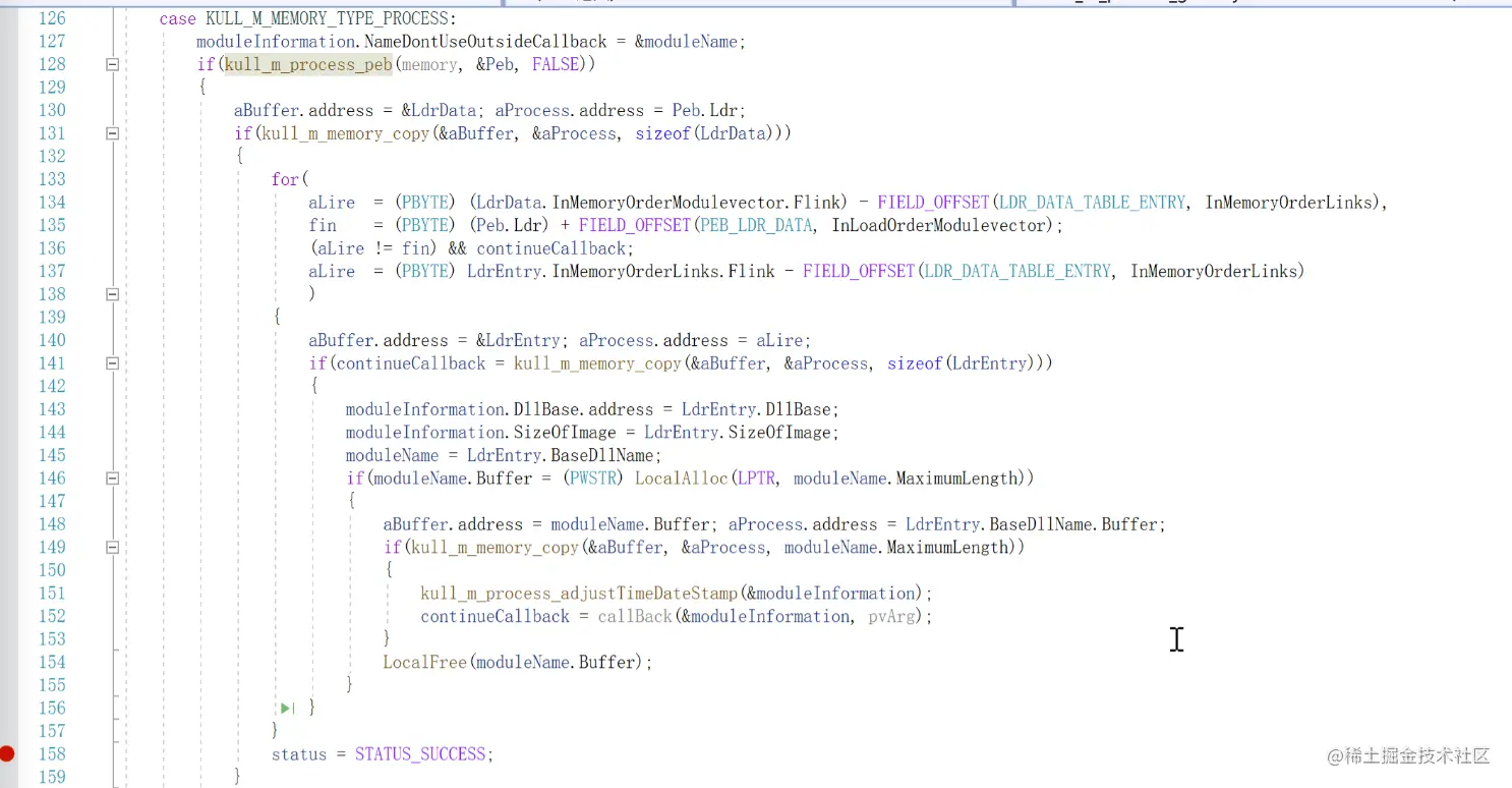 函数最开始有定义一个结构体来存储peb相关信息,使用kull_m_memory_copy函数根据不同的内存属性调用不同的内存拷贝函数这里调用的ReadProcessMemory函数