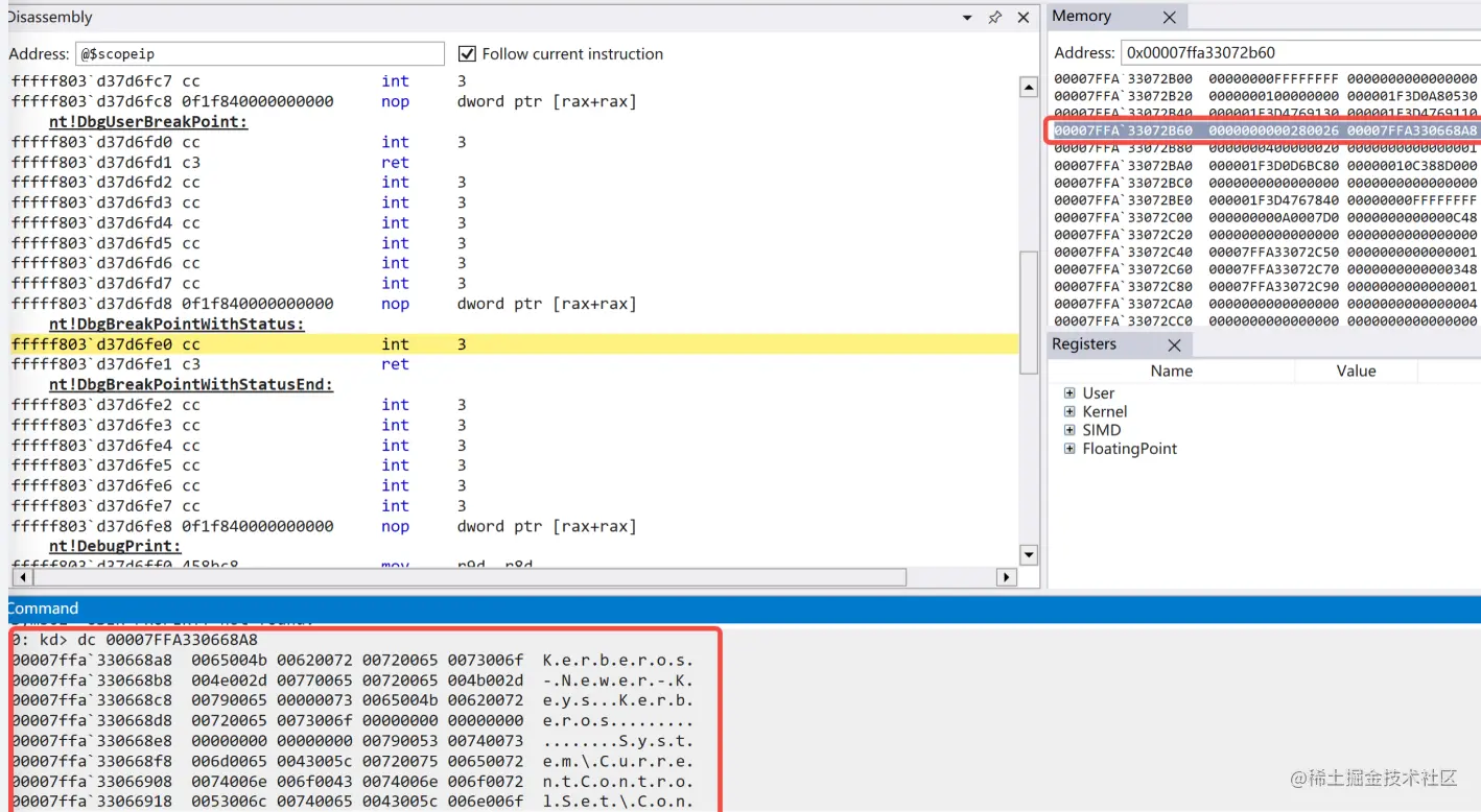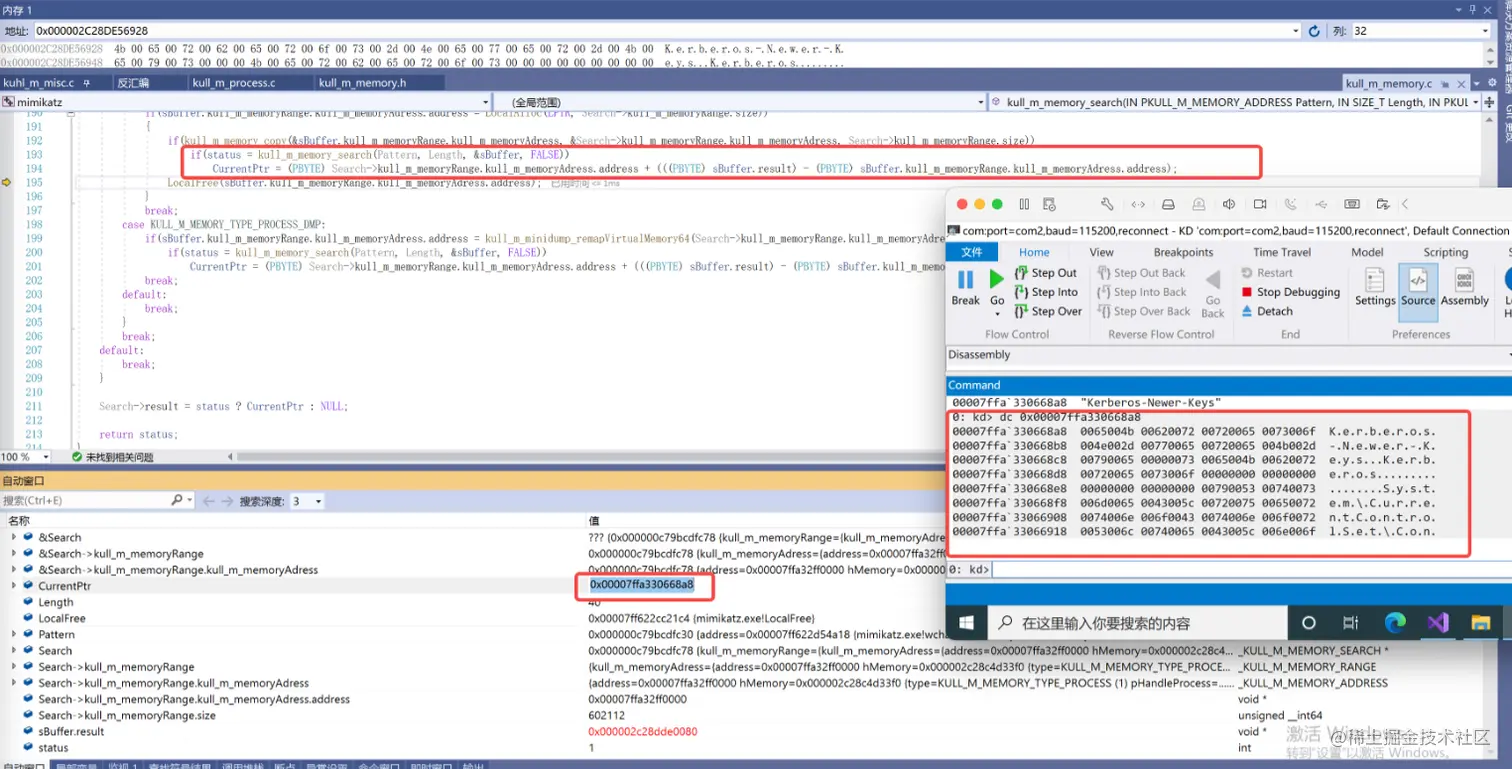 由于search结构体中存储了kdcsvc.dll内容但是没办法直接在其内存中搜索字符串将其拷贝到sbuffer后然后在sbuffer中找到Kerberos-Newer-Keys字符串并计算其偏移再加上kdcsvc.dll真实的首地址就获得了该字符串的真实偏移通过windbg中查询数据可以看到