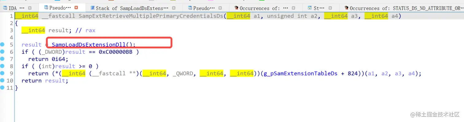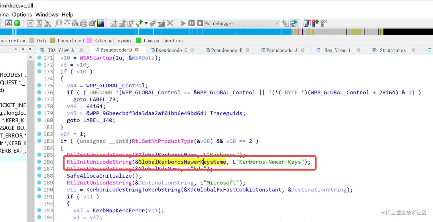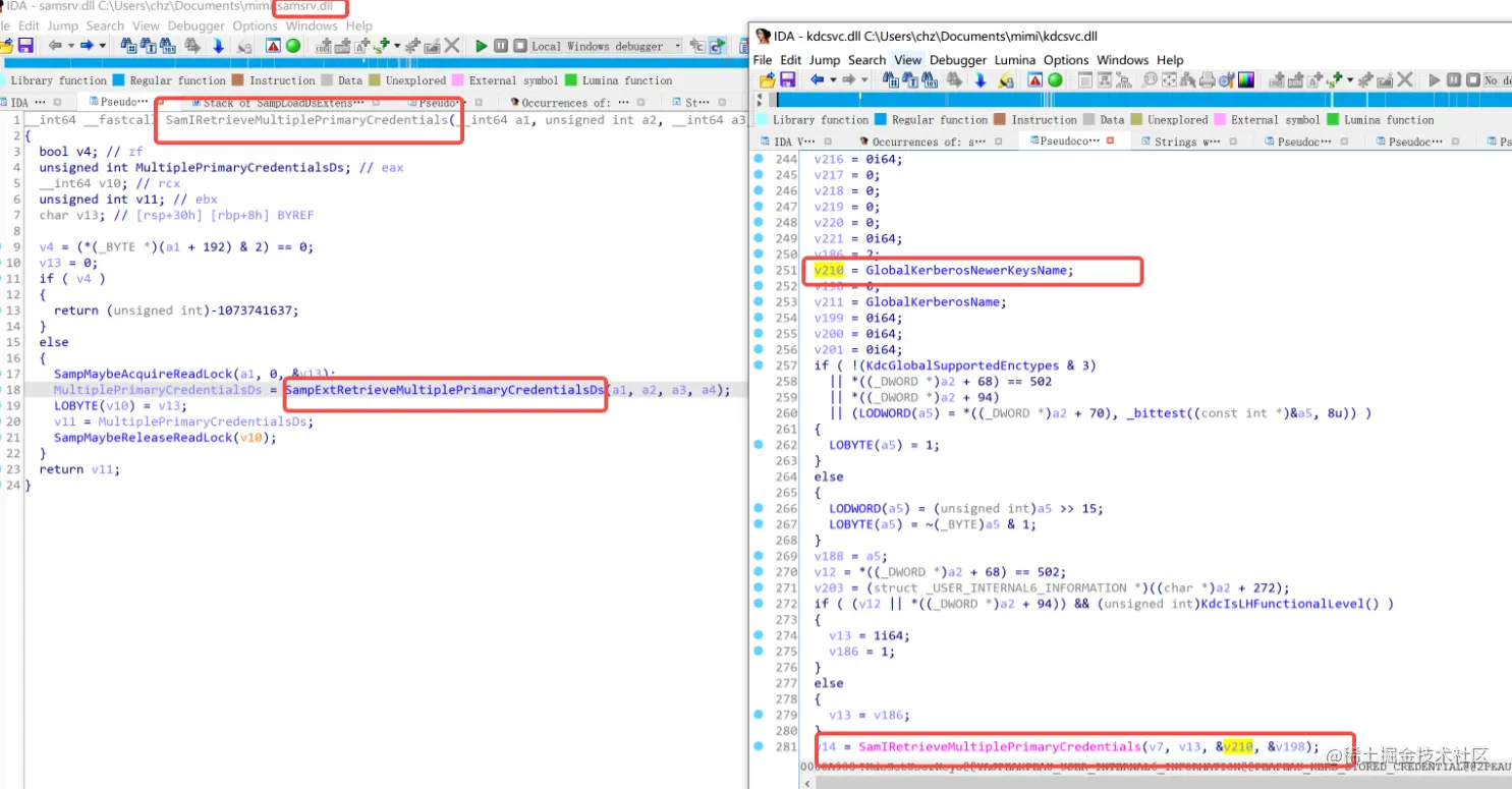 我们可以通过ida打开kdcsvc.dll查看具体的Kerberos-Newer-Keys包的使用细节发现是SamIRetrieveMultiplePrimaryCredentials函数调用的